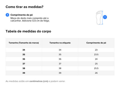 Medida aproximada dos pés para cada numeração: